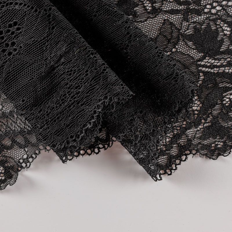 Эластичное кружево сочетает в себе мягкость, прочность и красоту, благодаря своей упругости оно долго не теряет первоначальную форму. Используется для пошива нижнего белья, а так же применяется как отделочный декор в одежде.