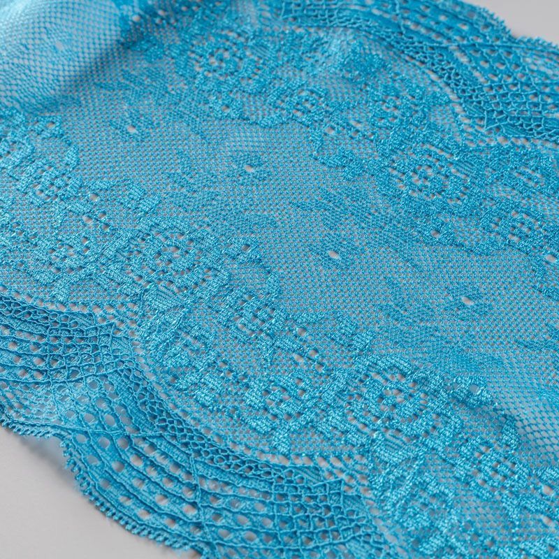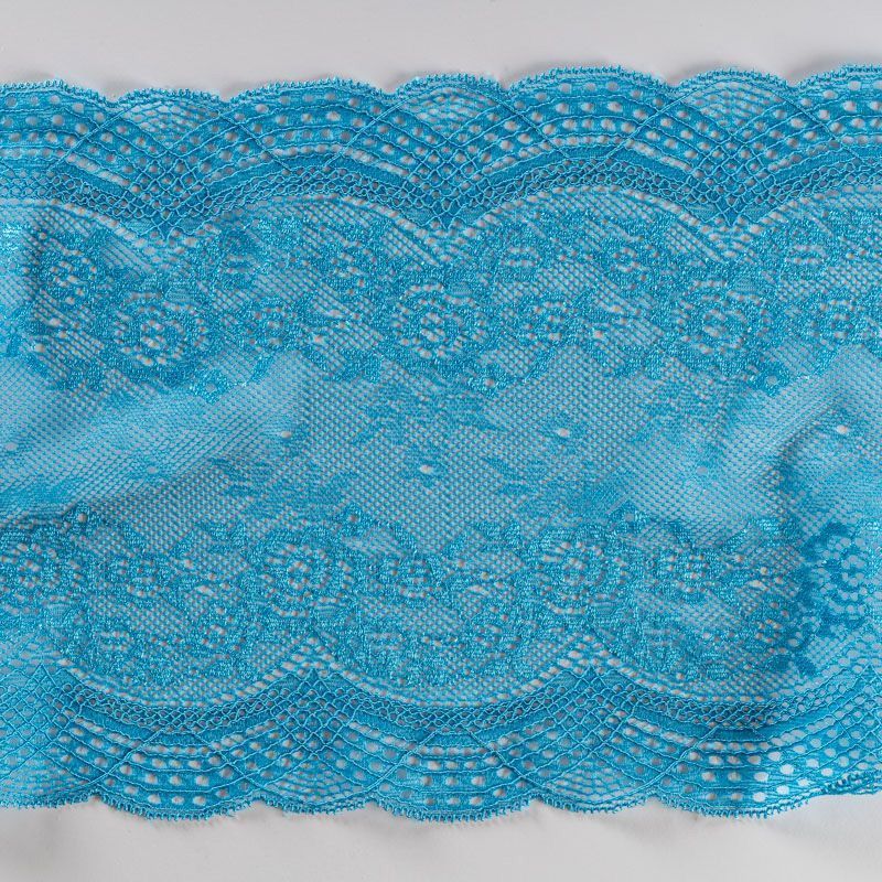 Эластичное кружево сочетает в себе мягкость, прочность и красоту, благодаря своей упругости оно долго не теряет первоначальную форму. Используется для пошива нижнего белья, а так же применяется как отделочный декор в одежде.