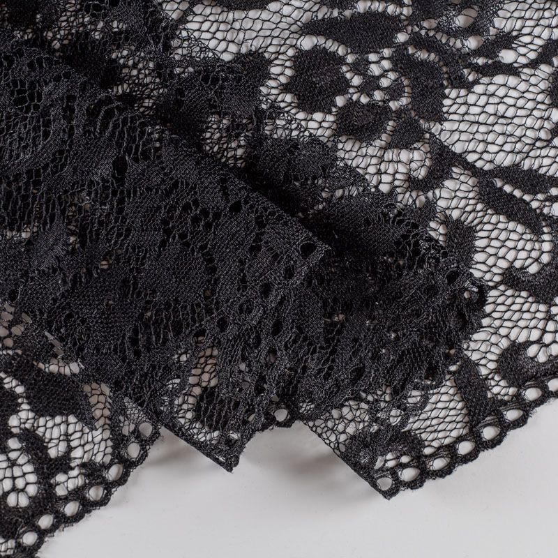 Эластичное кружево сочетает в себе мягкость, прочность и красоту, благодаря своей упругости оно долго не теряет первоначальную форму. Используется для пошива нижнего белья, а так же применяется как отделочный декор в одежде.