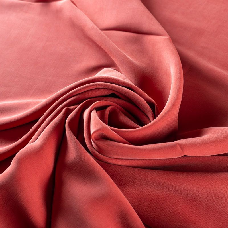 Купро плательно-костюмной плотности сложного красно-терракотового цвета. Ткань мягкая, пластичная, струящаяся, отлично драпируется, не просвечивает. Поверхность ткани бархатистая, похожа на мокрый шелк. Идеально подойдет для платьев свободного силуэта, брюк-палацио, юбок, шорт, туник, платья-рубашки, блузы.