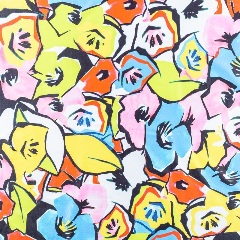 Итальянский бифлекс со стилизованным цветочным принтом. Поверхность ткани матовая и гладкая. Отлично тянется, одежда из него не сковывает движения. Хорошо впитывает влагу и быстро высыхает, не вызывет аллергии и раздражения. Используется для пошива эстрадных, спортивных костюмов, купальников, боди.