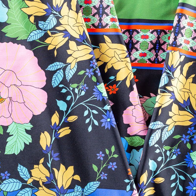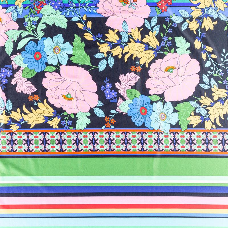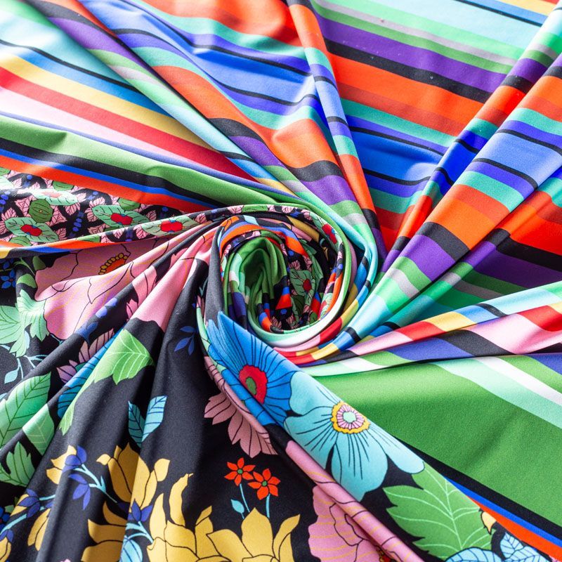 Итальянский бифлекс с сложным ярким принтом, сочетающим полоску, узоры и цветы. Поверхность ткани матовая и гладкая. Отлично тянется, одежда из него не сковывает движения. Хорошо впитывает влагу и быстро высыхает, не вызывет аллергии и раздражения. Используется для пошива эстрадных, спортивных костюмов, купальников, боди.