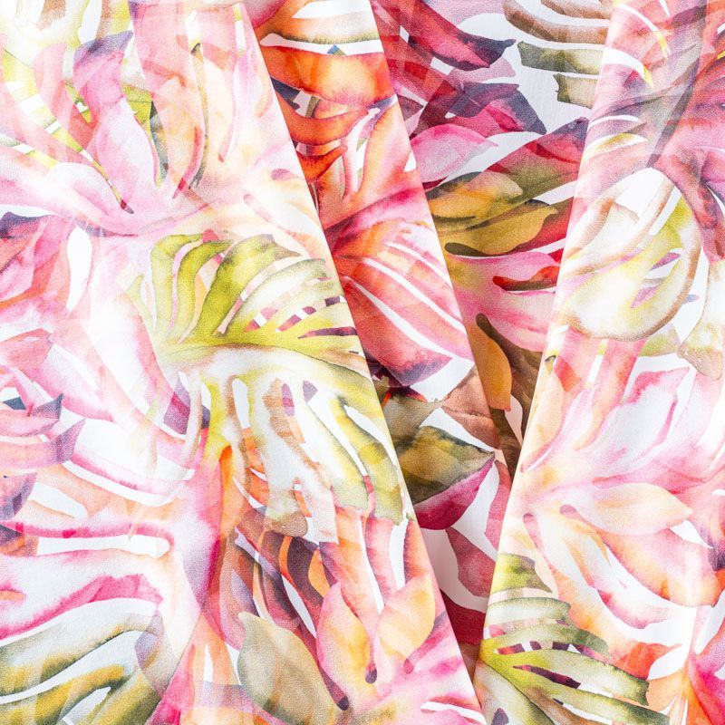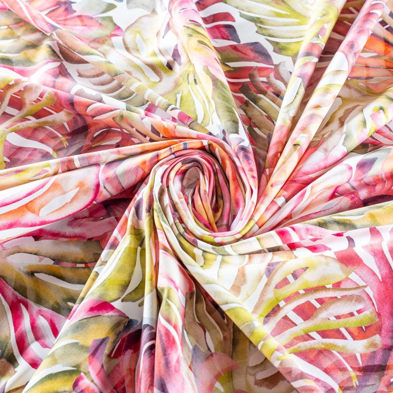 Итальянский бифлекс с крупным тропическим принтом. Поверхность ткани матовая и гладкая. Отлично тянется, одежда из него не сковывает движения. Хорошо впитывает влагу и быстро высыхает, не вызывет аллергии и раздражения. Используется для пошива эстрадных, спортивных костюмов, купальников, боди.
