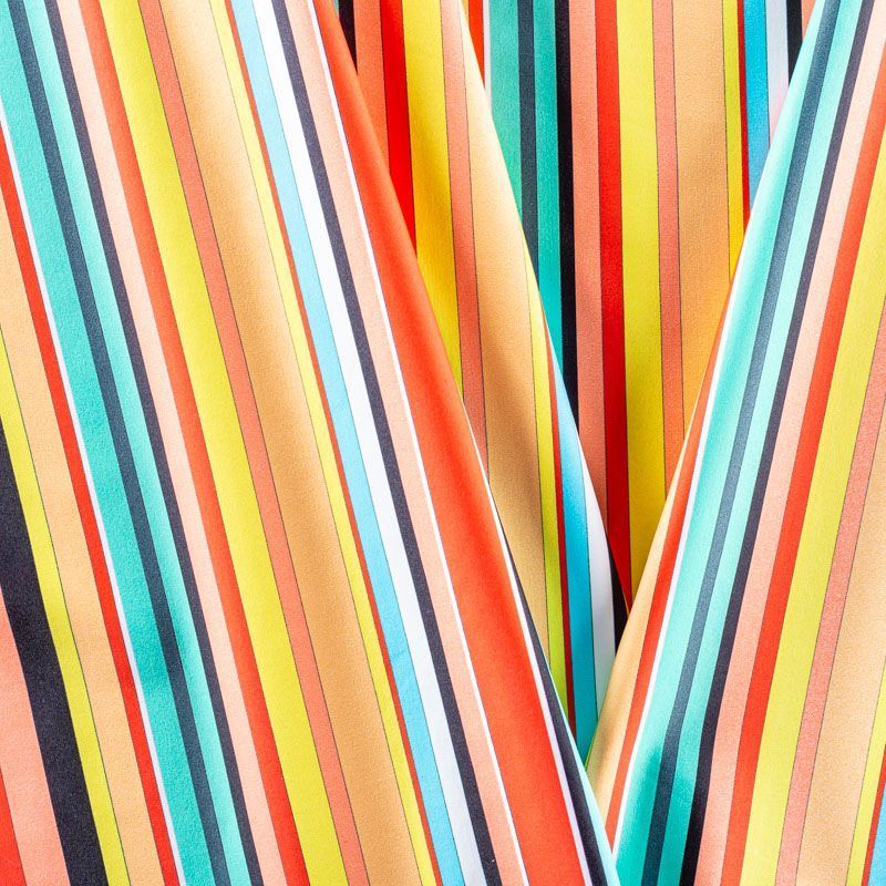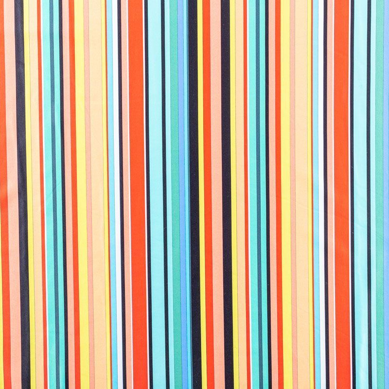 Итальянский бифлекс с разноцветными и разноразмерными полосками. Поверхность ткани матовая и гладкая. Отлично тянется, одежда из него не сковывает движения. Хорошо впитывает влагу и быстро высыхает, не вызывет аллергии и раздражения. Используется для пошива эстрадных, спортивных костюмов, купальников, боди.
