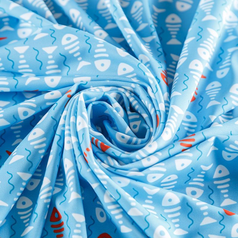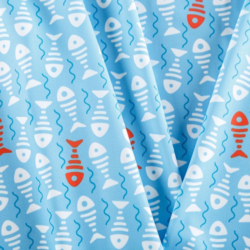 Итальяская качественная, красивая и приятная на ощупь лайкра голубого оттенка со стилизованным оригинальным принтом и матовой поверхностю. Идеально облегает фигуру, тянется по двум направлениям, хорошо драпируется, отлично держит форму, устойчива к пилингу, долговечна и гигроскопична. Используется для пошива одежды для танцев, гимнастики, фигурного катания, для велоспорта, легкой атлетики и аэробики, фитнеса и других видов спорта, для купальников, женского белья, театральных, цирковых и эстрадных костюмов.
