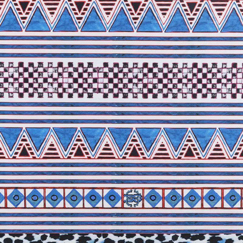 Итальяская качественная, красивая и приятная на ощупь лайкра белого цвета со сложным составным принтом в синих оттенках от известного бренда. Поверхность ткани матовая и гладкая. Идеально облегает фигуру, тянется по двум направлениям, хорошо драпируется, отлично держит форму, устойчива к пилингу, долговечна и гигроскопична. Используется для пошива одежды для танцев, гимнастики, фигурного катания, для велоспорта, легкой атлетики и аэробики, фитнеса и других видов спорта, для купальников, женского белья, театральных, цирковых и эстрадных костюмов.