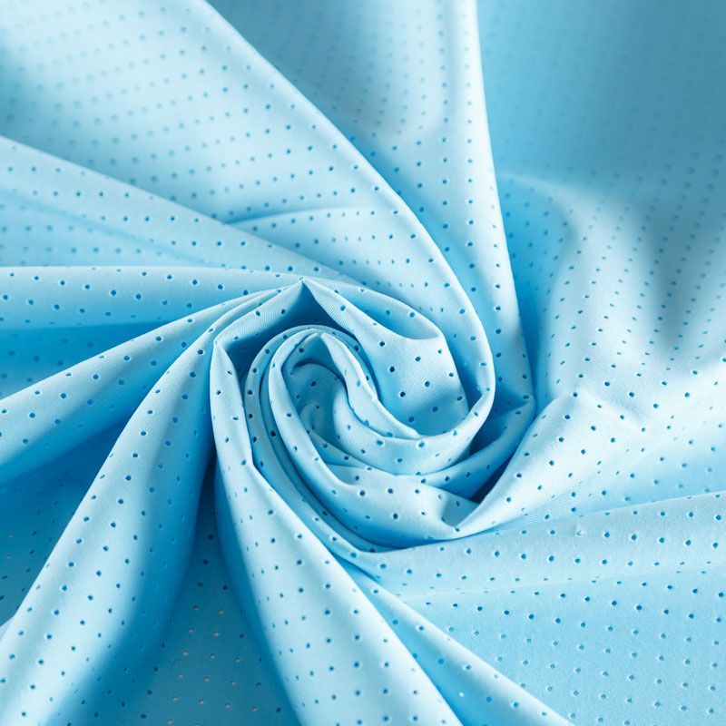 Итальяская качественная, красивая и приятная на ощупь лайкра с перфорацией голубого оттенка. Поверхность ткани матовая, гладкая, шелковистая на ощупь. Идеально облегает фигуру, тянется по двум направлениям, хорошо драпируется, отлично держит форму, устойчива к пилингу, долговечна и гигроскопична. Используется для пошива одежды для танцев, гимнастики, фигурного катания, для велоспорта, легкой атлетики и аэробики, фитнеса и других видов спорта, для купальников, женского белья, театральных, цирковых и эстрадных костюмов.