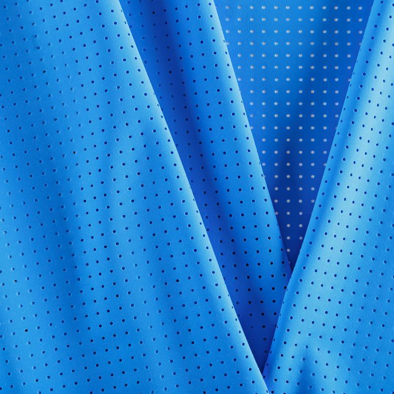 Итальяская качественная, красивая и приятная на ощупь лайкра с перфорацией синего оттенка. Поверхность ткани матовая, гладкая, шелковистая на ощупь. Идеально облегает фигуру, тянется по двум направлениям, хорошо драпируется, отлично держит форму, устойчива к пилингу, долговечна и гигроскопична. Используется для пошива одежды для танцев, гимнастики, фигурного катания, для велоспорта, легкой атлетики и аэробики, фитнеса и других видов спорта, для купальников, женского белья, театральных, цирковых и эстрадных костюмов.