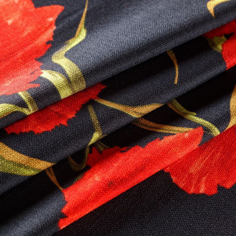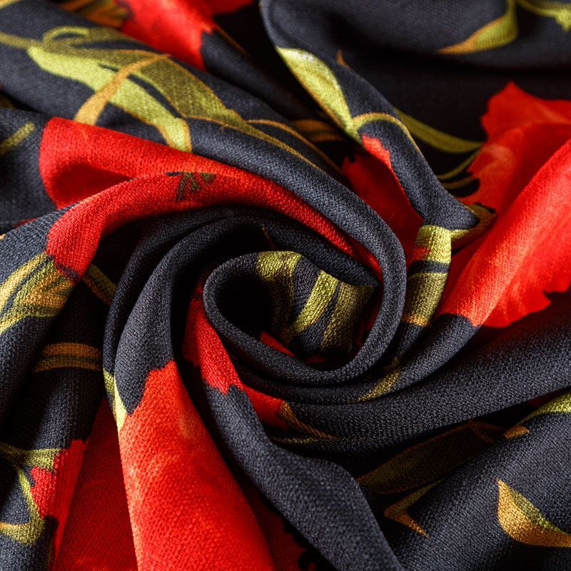 Мягкая, пластичная ткань черного цвета с ярким цветочным принтом, с выразительной матовой рельефной поверхностью и полотняным переплетением, хорошо драпируется, тянется. Прекрасно подойдет для пошива брюк, шорт, юбок, платьев, сарафанов, жакетов, кардиганов.
