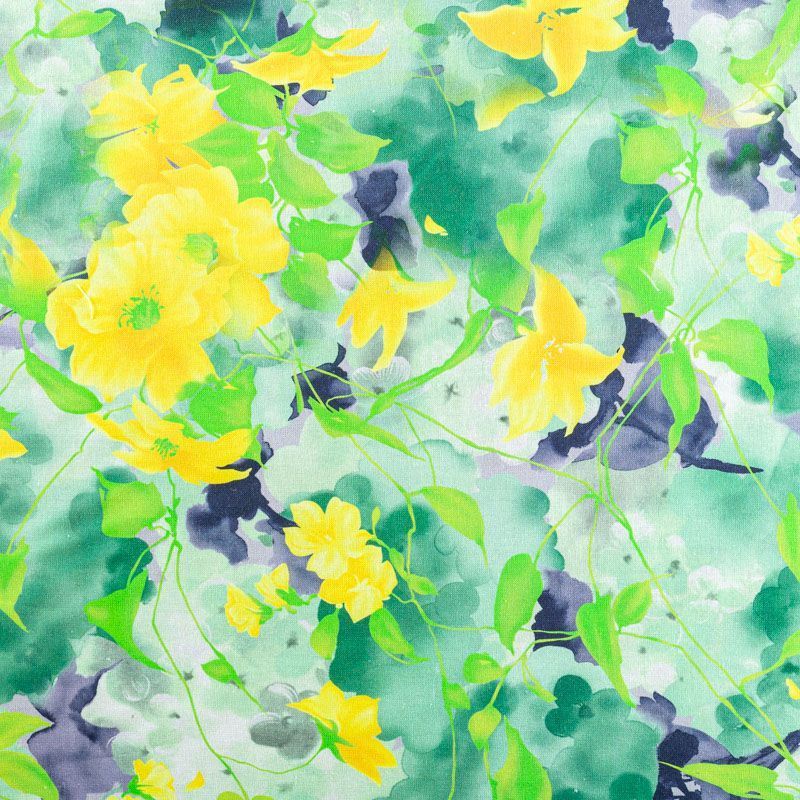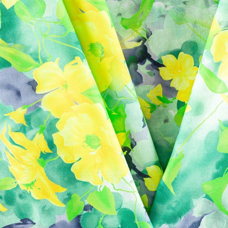 Льняная плательно-рубашечная ткань с добавлением бемерии в зеленых оттенках с цветочным акварельным принтом. Материал прочный, с выразительной матовой рельефной поверхностью, полотняным плетением, хорошо держит форму, мягкий на ощупь, пластичный, отлично драпируется. Прекрасно подойдет для пошива летних платьев, сарафанов, юбок, рубашек, брюк и шорт.