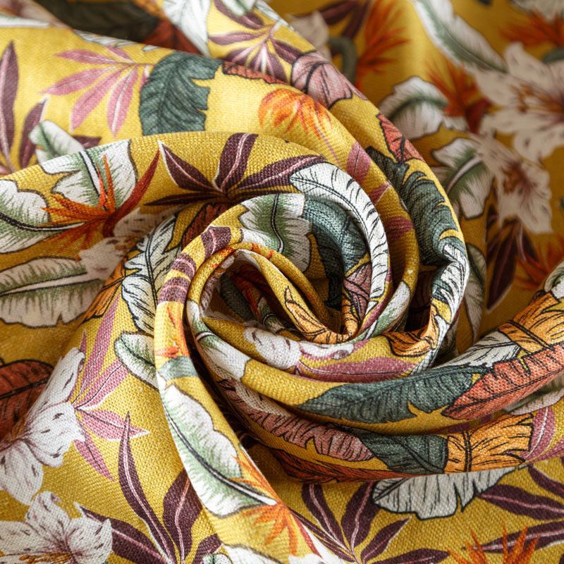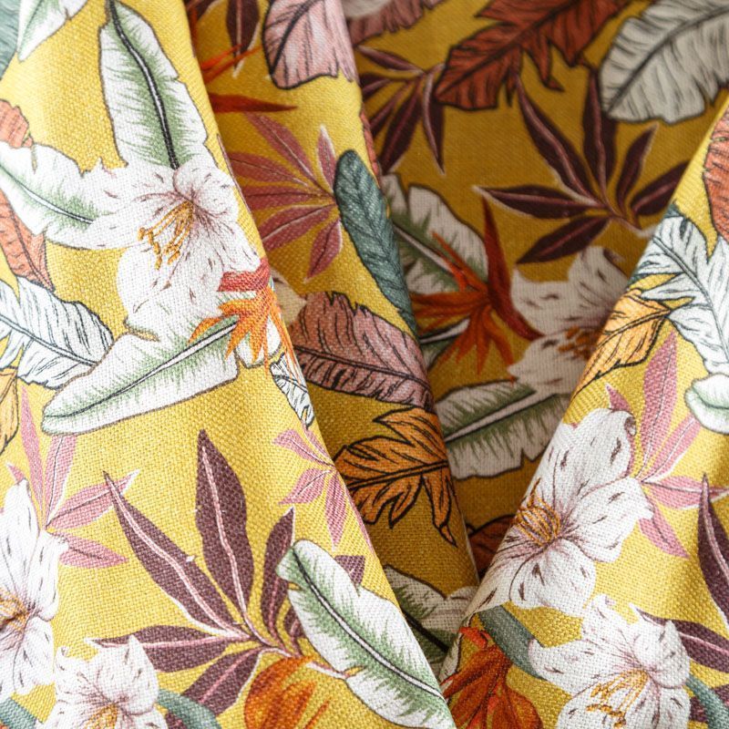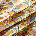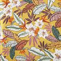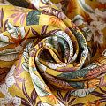 Итальянский костюмно-плательный лен с тропическим принтом на горчичном фоне. Ткань прочная, имеет матовую рельефную поверхность и полотняное переплетение, отлично держит форму, пластичная, комфортная в изделии. Отлично подойдет для пошива для летних костюмов, рубашек, туник, платьев, сарафанов, юбок, жакетов, брюк или шорт.