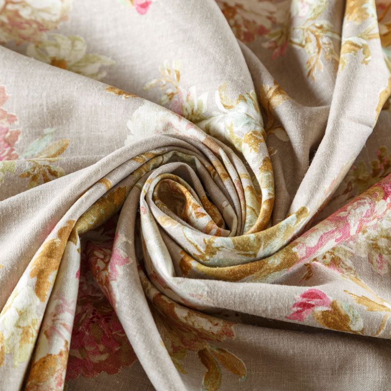 Итальянский костюмно-плательный лен с добавлением вискозы с цветочным принтом на светло-сером фоне. Ткань прочная, имеет матовую рельефную поверхность и полотняное переплетение, отлично держит форму, пластичная, комфортная в изделии. Отлично подойдет для пошива для летних костюмов, рубашек, туник, платьев, сарафанов, юбок, жакетов, брюк или шорт.