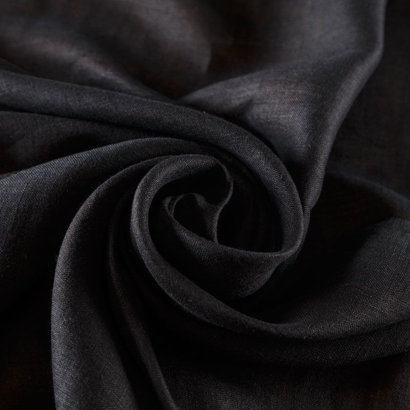Итальянский плательно-рубашечный лен черного цвета. Ткань прочная, имееет на ощупь приятную, гладкую поверхность, а визуально - выраженный рельеф и полотняное переплетение, пластичная, хорошо драпируется, полупрозрачная. Подойдет для пошива широких брюк, рубашек, туники, юбок, платьев, сарафанов, топов, комбинезонов.
