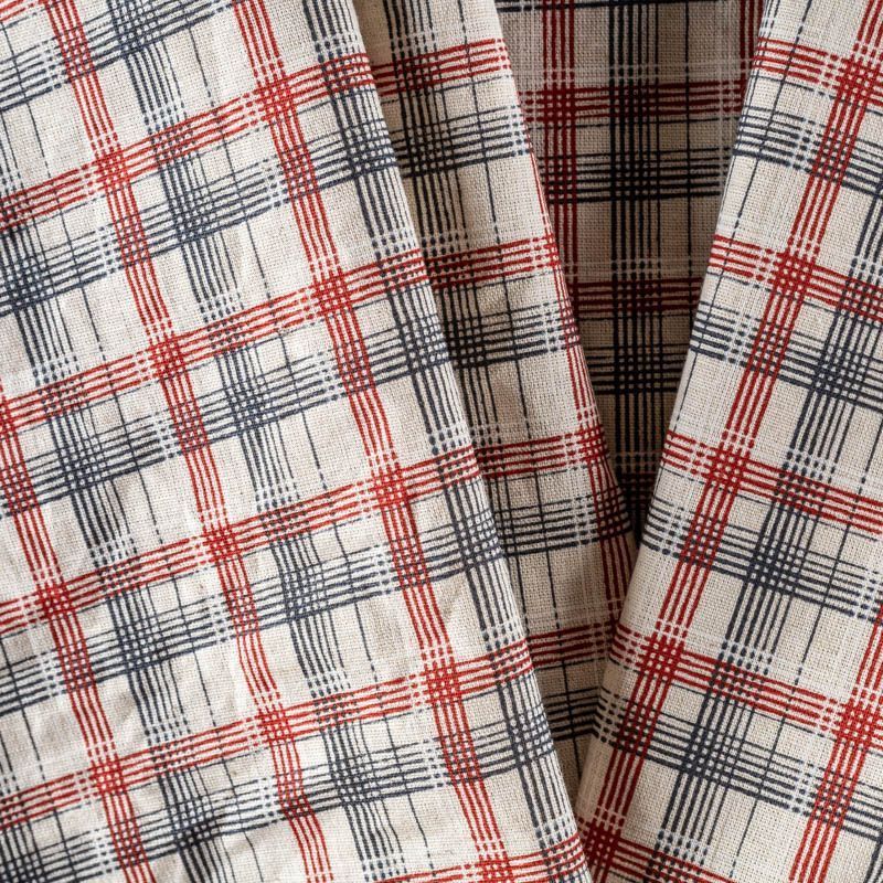 Прочный, выразительная матовая рельефная поверхность, полотняное переплетение, хорошо держит форму, жестковатый на ощупь,сложно драпируется. Прекрасно подойдет для пошива летних жакетов, жилетов, брюк и шорт. Сочетание линий черного, красного и белого цветов образует сложную красивую клетку.