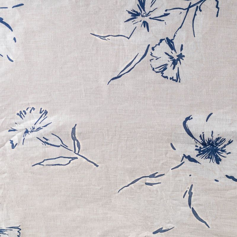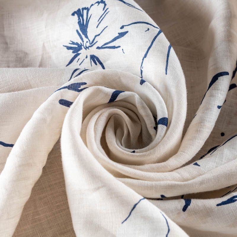 Прочный, выразительная матовая рельефная поверхность, полотняное переплетение, неплохо держит форму, немного просвечивает, хорошо драпируется. Прекрасно подойдет для пошива летних платьев, сарафанов, юбок, брюк и шорт. Бело-синий сдержанный цветочный принт на натуральном фоне экрю.