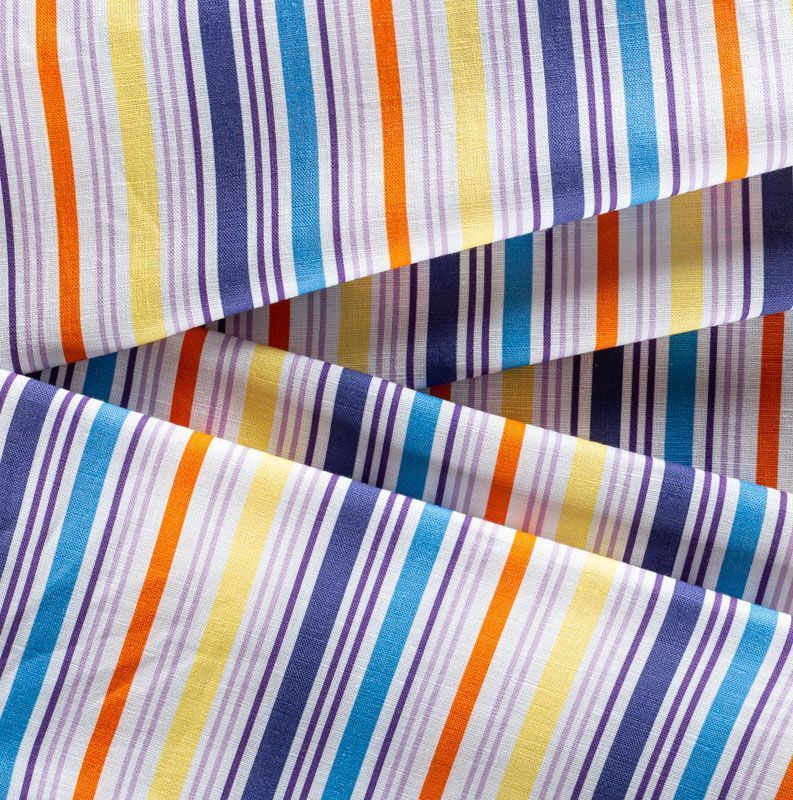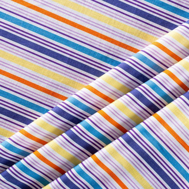 Итальянский лен с добавлением вискозы средней плотности с принтом в разноцветную вертикальную полоску. Ткань прочная, имееет выразительную матовую рельефную поверхность и полотняное переплетение, хорошо держит форму. Подойдет для пошива весенне-летних костюмов, платьев, брюк, шорт, топов, сарафанов.