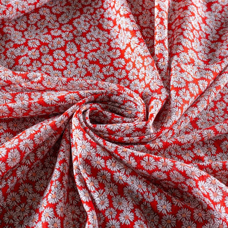 Итальянский плательно-рубашечный лен с добавлением вискозы с мелким цветочным принтом на ярком красном фоне. Ткань прочная, но тонкая, имееет выразительную матовую рельефную поверхность и полотняное переплетение, хорошо держит форму. Подойдет для пошива весенне-летних платьев, брюк, шорт, топов, сарафанов.