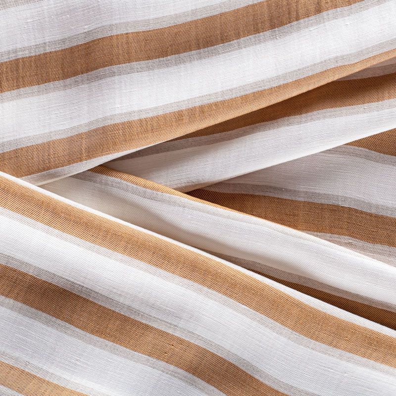 Итальянский плательно-рубашечный лен с добавлением вискозы, средней плотности, в полоску бежевых оттенков. Рисунок расположен перпердикулярно кромке. Ткань прочная, имееет выразительную матовую рельефную поверхность и полотняное переплетение, хорошо держит форму. Подойдет для пошива весенне-летних костюмов, платьев, брюк, шорт, топов, сарафанов.