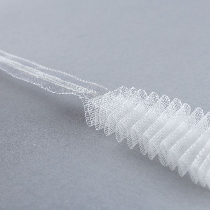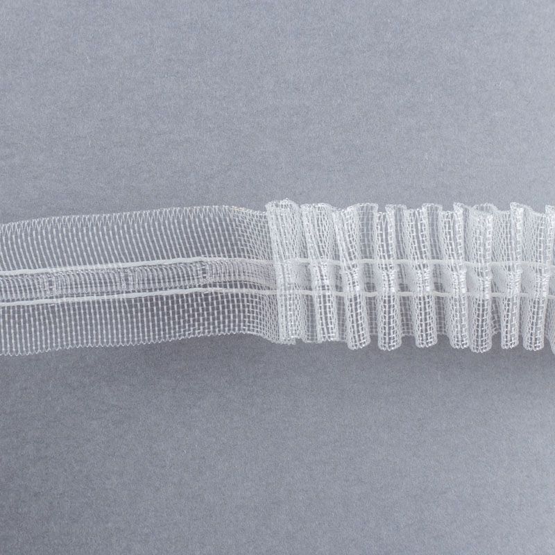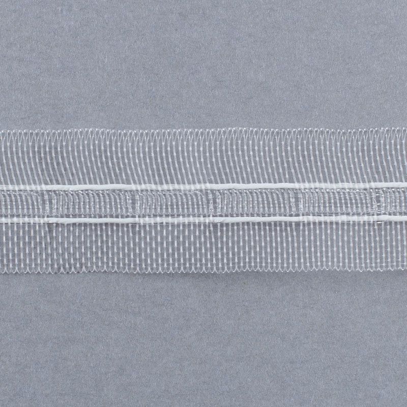 Узкая прозрачная шторная лента для тюлей и портьерных тканей c карандашной складкой. Сокращение - регулируемое, произвольное, 1 ряд белых текстильных кармашков, стягивается на 2 нитки, крепление - крючки.