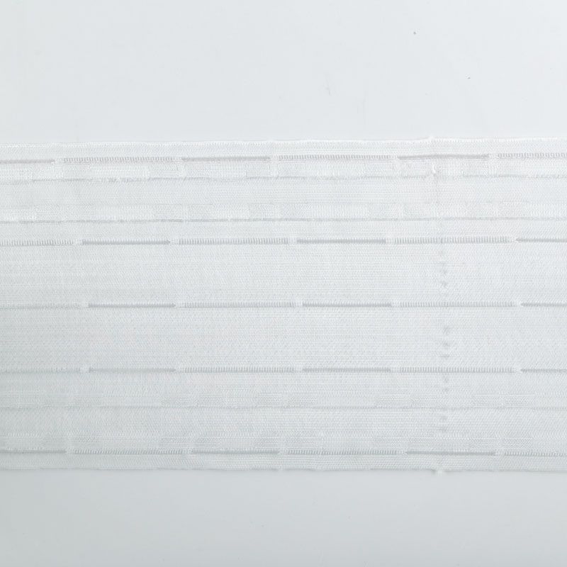 Шторная лента полностью прозрачная для тюлей и портьерных тканей с гофрированными встречными складками. Сокращение - 1:2, раппорт - 10 см, ширина ленты - 150 мм, 4 ряда кармашков, 5 стягивающих нитей, крепление - крючки.