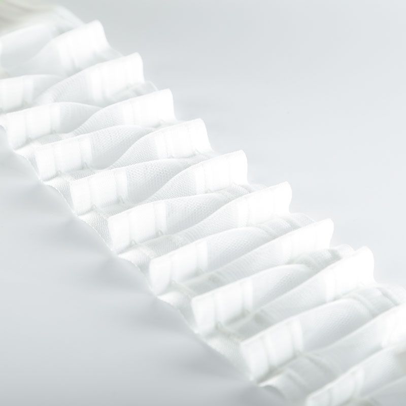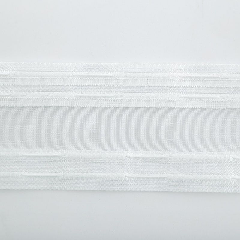 Шторная лента полностью прозрачная для тюлей и портьерных тканей с гофрированными встречными складками. Сокращение - 1:2, раппорт - 6,5 см, ширина ленты - 76 мм, 2 ряда кармашков, 4 стягивающие нити, крепление - крючки.