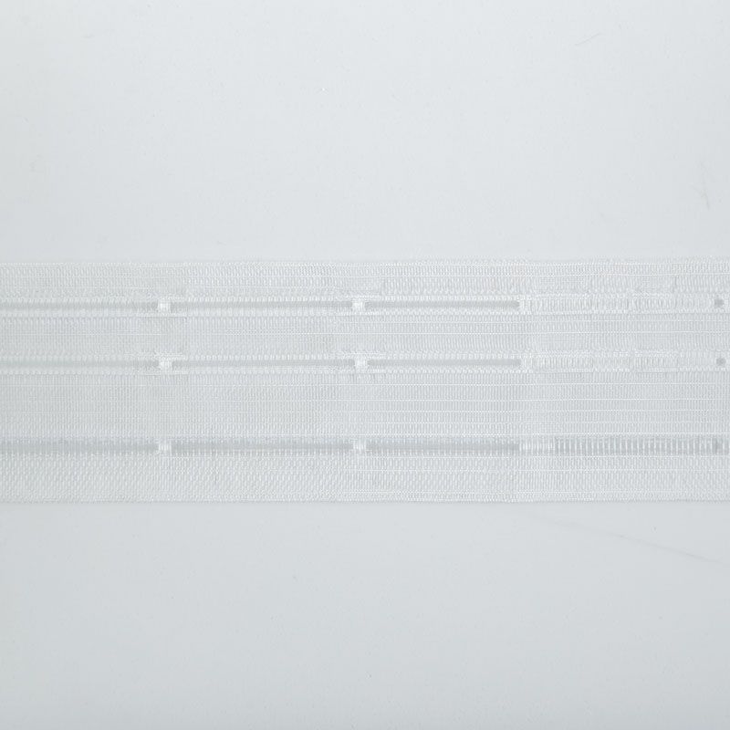 Шторная лента полностью прозрачная для тюлей и портьерных тканей с 4-ой бантовой складкой. Сокращение - 1:3, раппорт - 24 см, расстояние между складками - 8 см, 2 ряда кармашков, крепление - крючки.