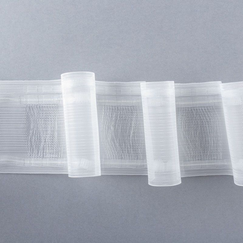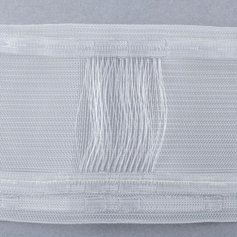 Шторная лента полностью прозрачная для тюлей и легких портьерных тканей с вафельной сборкой. Сокращение - 1:2,5, раппорт - 6,5 см, 2 ряда кармашков, крепление - крючки.