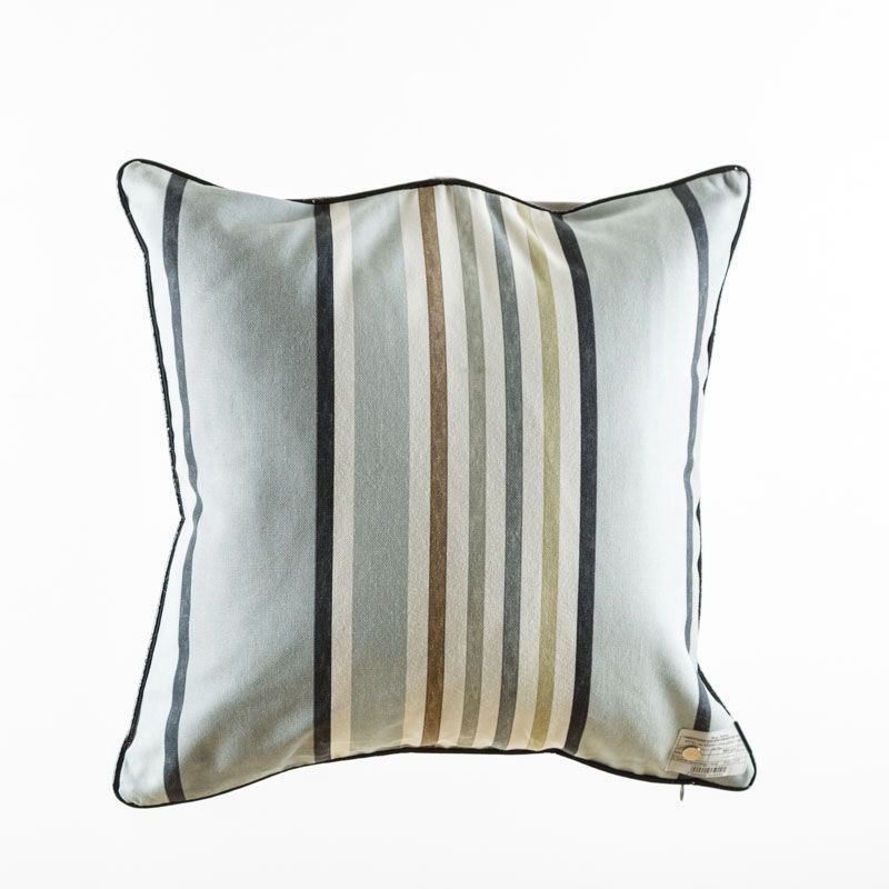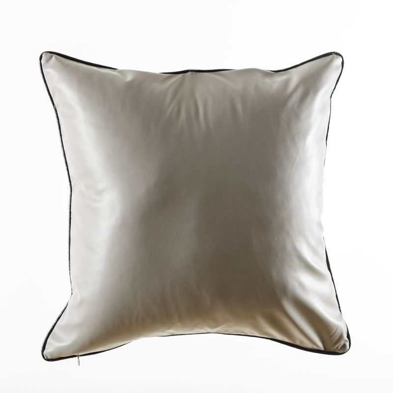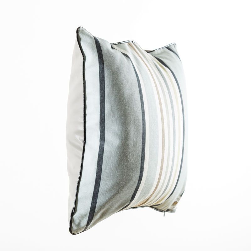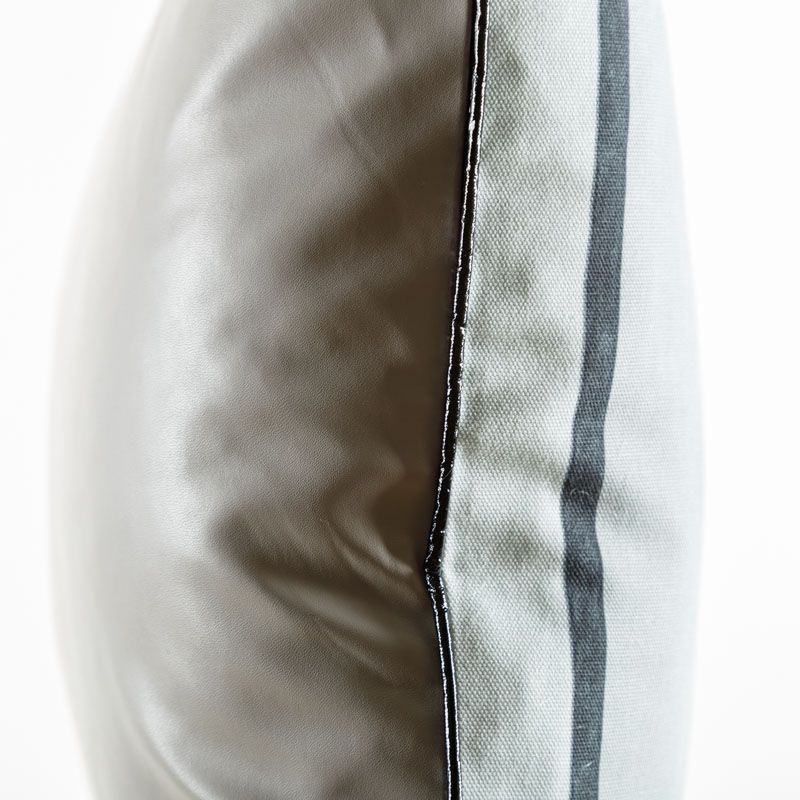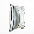 Оригинальная дизайнерская наволочка на подушку 45х45 см. Лицевая сторона выполнена из портьерной ткани в полоску в серо-голубых оттенках. Обратная сторона - экокожа светло-серого цвета. Наволочка декорирована черным лакированным кантом. Потайная молния расположена в нижнем шве. Декоративные подушки сделают акцет на цветовой гамме Вашего помещения, подчеркнут особенности интерьерного стиля или тематику оформления. Внимание! Подушка-вкладыш приобретается отдельно.