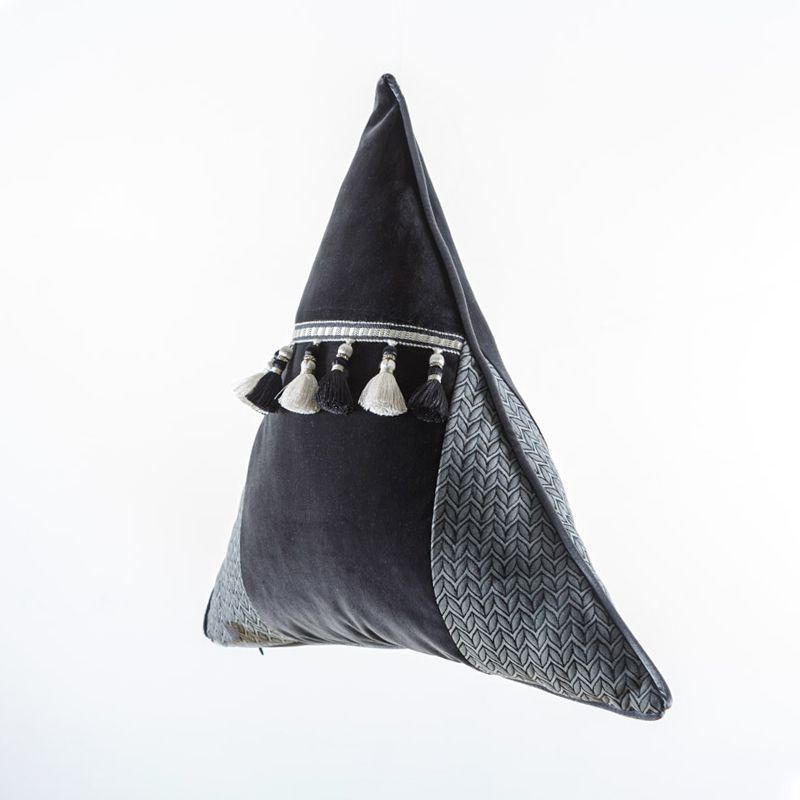 Оригинальная треугольная дизайнерская наволочка 50х50х50 см. Выполнена из жаккарда и бархата и декорирована бахромой и кантом. Потайная молния расположена в нижнем шве. Декоративные подушки сделают акцет на цветовой гамме Вашего помещения, подчеркнут особенности интерьерного стиля или тематику оформления. Внимание! Подушка-вкладыш или синтепон приобретаются отдельно.