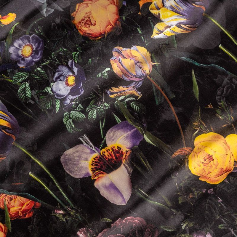 Шелковая органза с крупным ярким цветочным принтом на черном фоне. Хорошо держит форму, легкая, тонкая, просвечивает. Подойдет на блузку, платье, тунику или юбку.