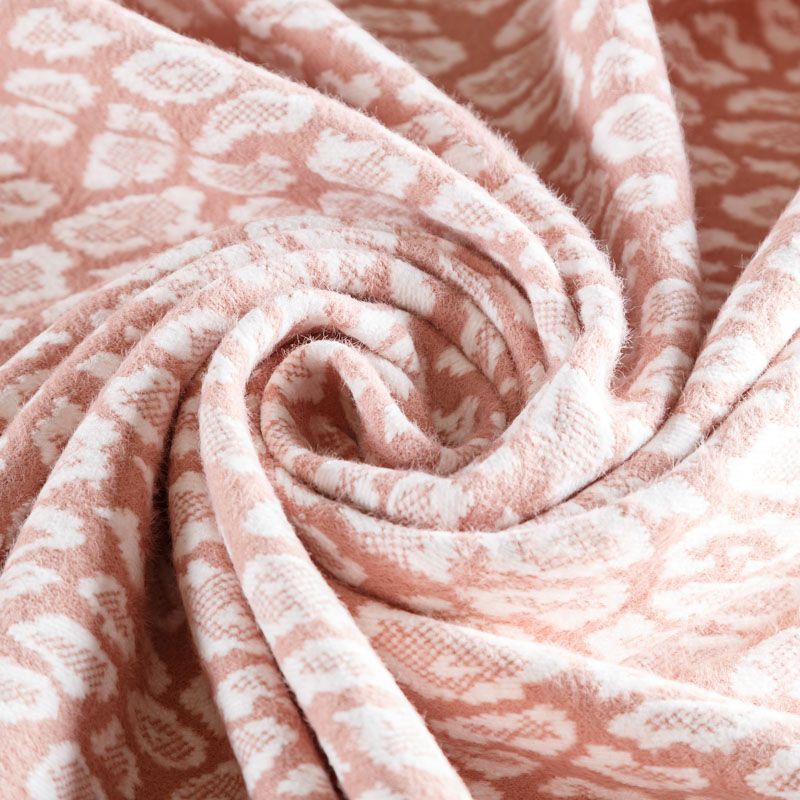 Плотный двухслойный пальтовый трикотаж розового оттенка со стилизованным анималистическим узором белого цвета. Ткань очень приятная на ощупь, пластичная, теплая и уютная, поверхность мягкая и шелковистая. Изнанка однотонная молочного оттенка. Прекрасно подойдет для  пошива пальто, теплых жакетов, курток, кардиганов, костюмов.