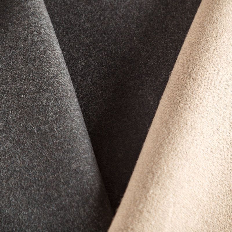 Двухслойный двусторонний итальянский шерстяной трикотаж в бежево-серой гамме. Полотно пластичное, приятное на ощупь, не колется, теплое и уютное. При соответствующей обработке швов одежду из этого трикотажа можно носить на обе стороны. Подойдет для пошива теплых кардиганов, пальто, костюмов, теплого платья, пончо, кейпа.