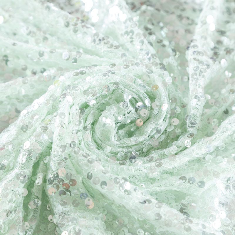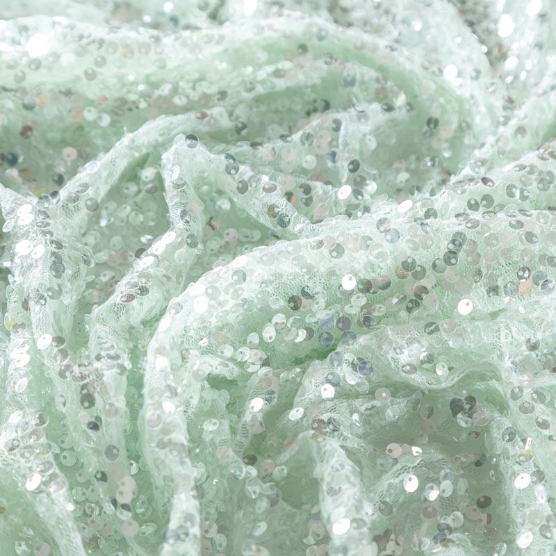 Итальянское ажурное кружевное полотно мятного оттенка с цветочным рисунком и нашитыми на него прозрачными глянцевыми пайетками с лицевой стороны. Ткань полупрозрачная, требуется подклад. Очень мягкая и пластичная, эффектно переливается при движении, хорошо драпируется. Пайетки — идеальный материал для праздников и вечеринок. Из них получится эффектное платье, туника, топ, юбка или комбинезон.