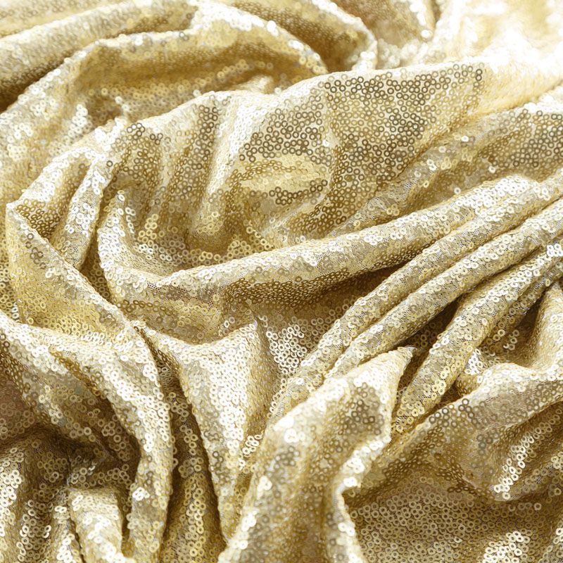 Блестящие пайетки в золотистом оттенке. Мелкие, размером около 3 мм, расположены в хаотичном порядке. Основа - мягкая и эластичная сетка.  Ткань полупрозрачная, может потребоваться подклад. Подойдет для вечернего, коктейльного платья, юбки, нарядных детских изделий, танцевальных и сценических костюмов.
