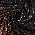 Двухцветные итальянские пайетки на эластичной сетке черного цвета. Разделение оттенков направлено вдоль линии кромки, это позволяет шить изделия как в вертикальной, так и горизонтальной раскладке. Пайетки мелкие, имеют глянцевый блеск и красиво переливаются на свету. Ткань пластичная, отлично драпируется, не прозрачная за счет большой плотности пайеток. Отлично подойдет для пошива веречних и праздничных образов: юбки, платья, комбинезона, шорт, туники или топа.