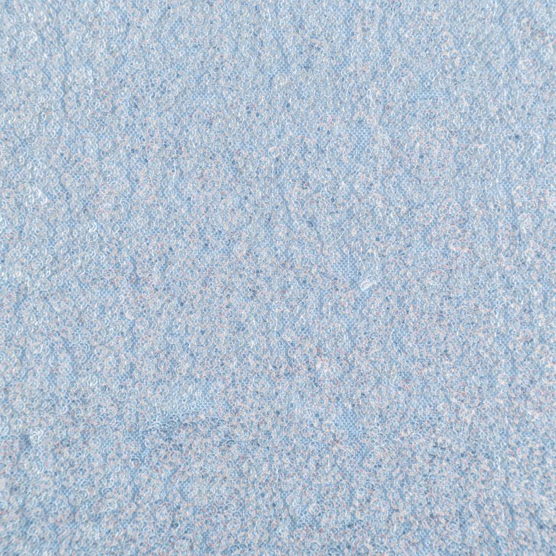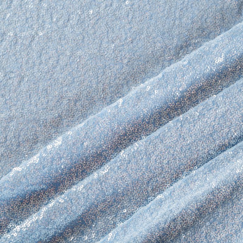 Тонкая эластичная сетка голубого оттенка по всей поверхности усеяна мелкими прозрачными глянцевыми пайетками. Ткань очень хорошо драпируется, красиво переливается, имеет глянцевый блеск, пластичная и эластичная и в длину, и в ширину. Пайетки — идеальный материал для праздников и вечеринок. Из них получится эффектное платье, жакет, боди, топ, туника, юбка или комбинезон.