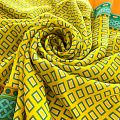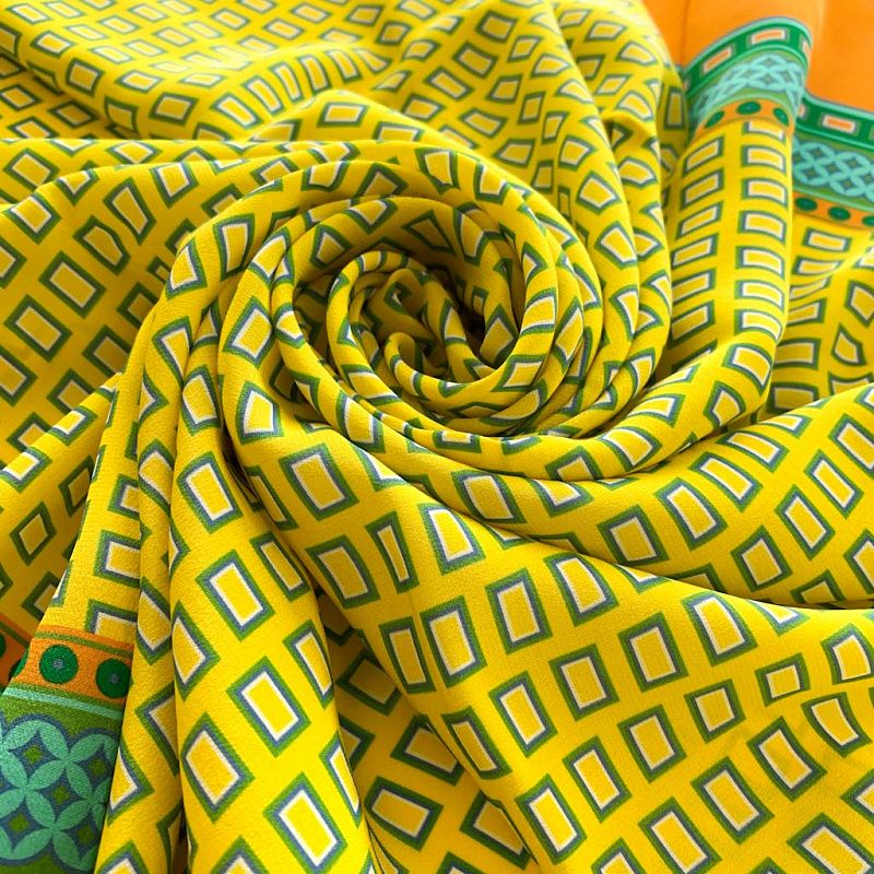 Модный платок с геометрическим рисунком - в эффектном и стильном сочетании акцентов в цветовой гамме. Здесь и белый, и желтый, и яркий зеленый и насыщенный апельсиновый. Платок выполнен из итальянского натурального шелка, поверхность креповая, не прозрачный. Будет эффектным дополнением к любому образу.
