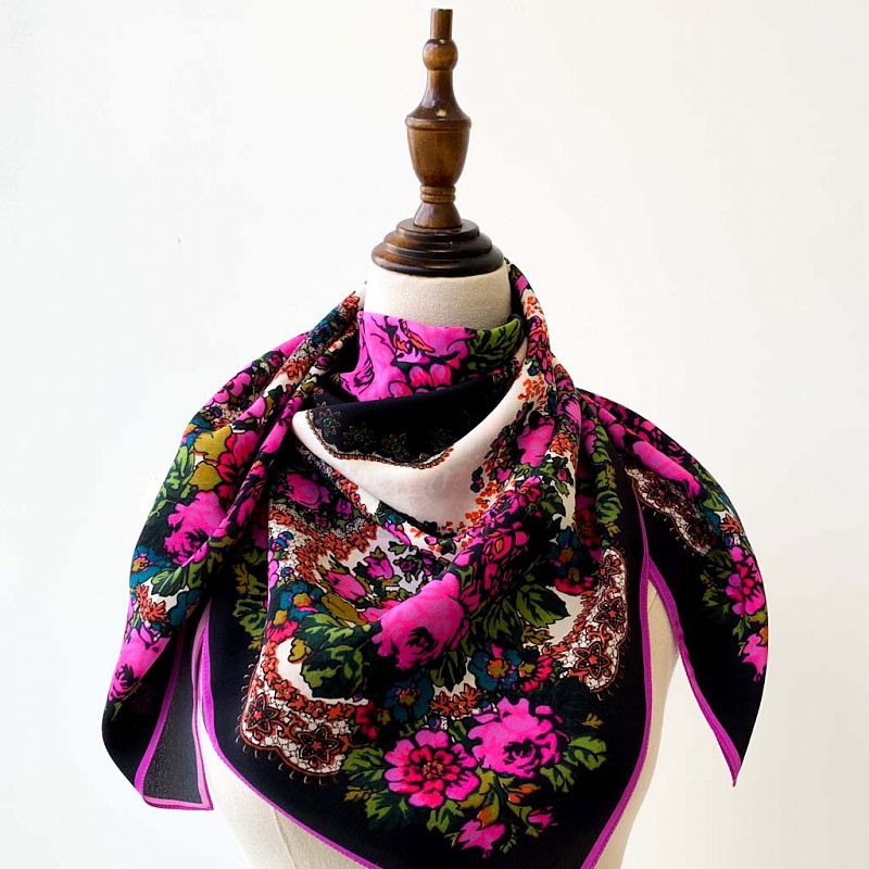Платок выполнен из натурального итальянского шелка с креповой поверхностью. Очень красивый рисунок в фольклорном стиле по типу павлопосадских узоров в цвете фуксия на черном фоне. Шикарная вещь украсит образ и будет отличным дополнением к Вашему наряду.