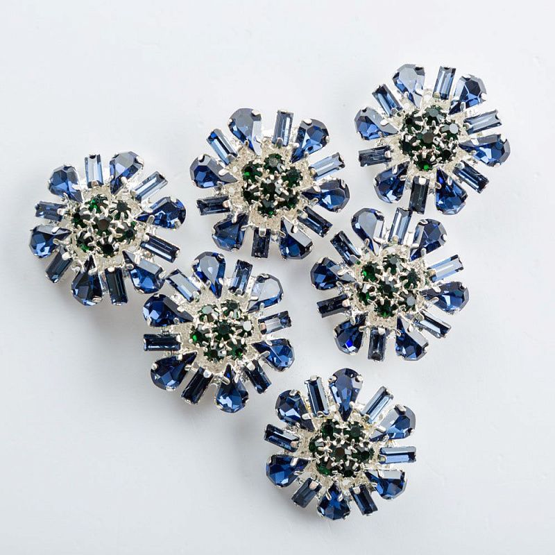 Круглые пришивные, не тяжелые пуговицы, изготовленные прессовым способом из сплава с кристаллическим стеклом сапфирового оттенка. Прекрасно подойдут для различных изделий сегмента верхней одежды, костюмов, вязанной одежды, в качестве украшений.