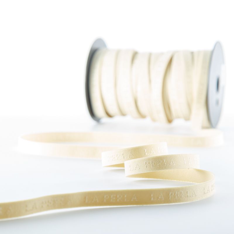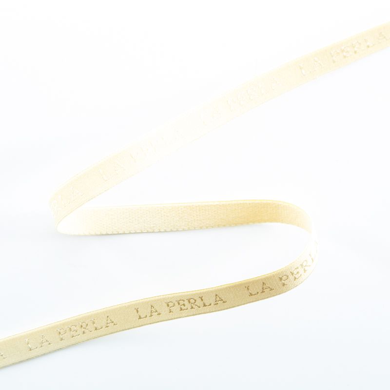 Бретелечная резинка используется для обработки стана бюстгальтера, а также для бретелей. Матовая с жаккардовой надписью бренда. Края ровные.