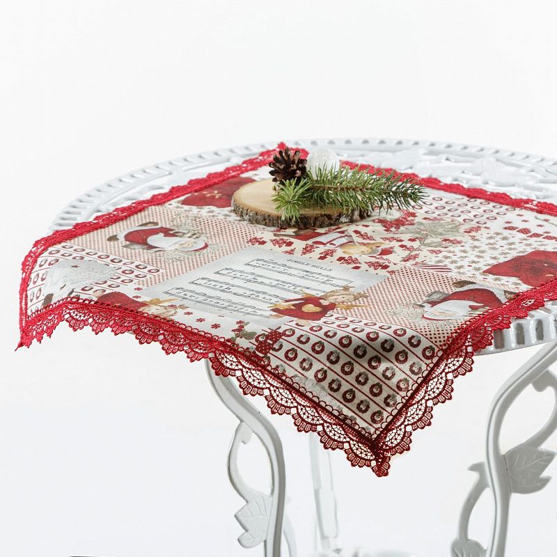 Декоративная сервировочная салфетка выполнена из смесовой хлопковой ткани с рождественскими мотивами и декорирована ажурной тесьмой бордового цвета.