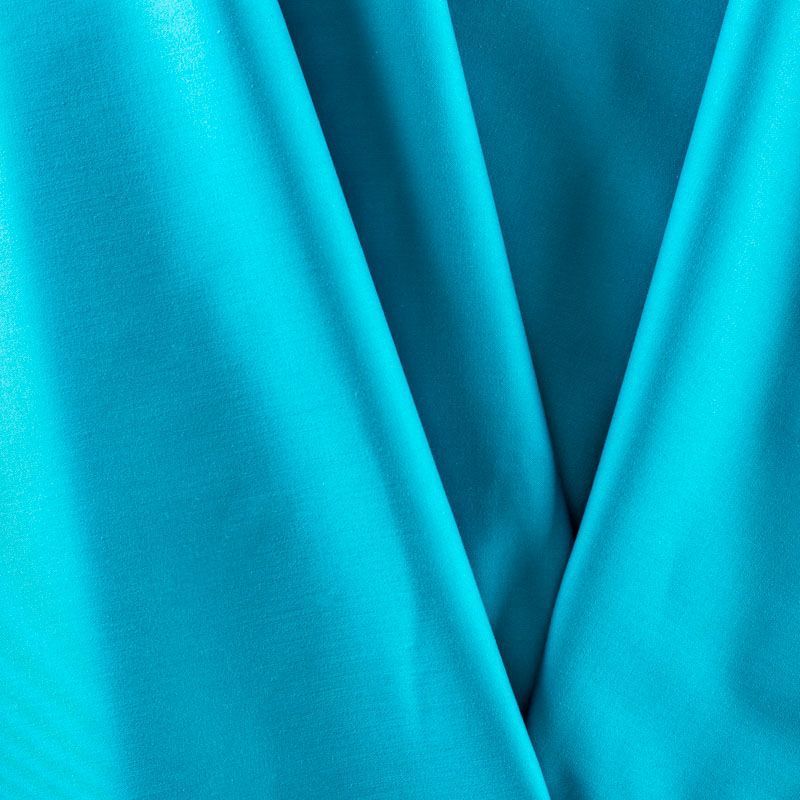 Итальянский сатин-коттон лазурно-голубого цвета. Поверхность гладкая со сдержанным блеском, ткань плотная, но не толстая, хорошо держит форму, тянется за счет эластана в составе. Подойдет для пошива костюма, жакета, юбки, платья, брюк или шорт.