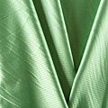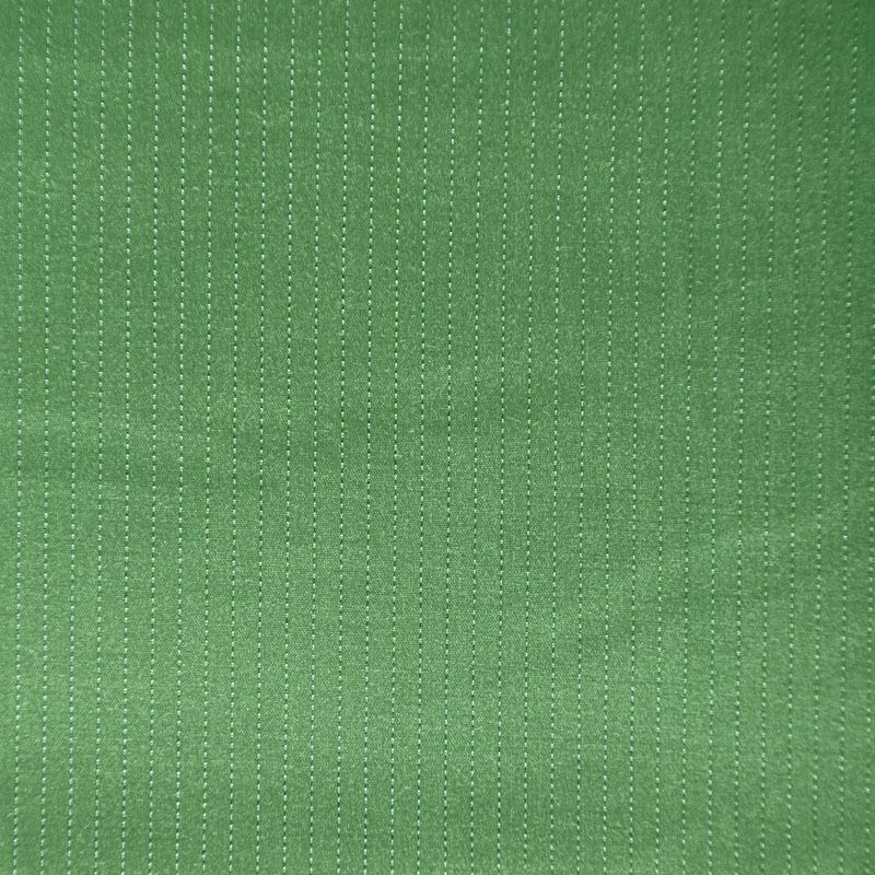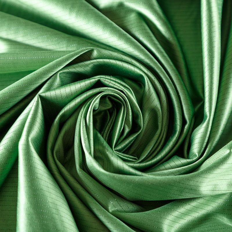 Сатин-коттон в зеленом оттенке с тонкими полосками люрексовой нити. Поверхность гладкая со сдержанным блеском, ткань средней плотности, не толстая, хорошо держит форму, тянется за счет эластана в составе. Подойдет для пошива костюма, жакета, юбки, платья, брюк или шорт.
