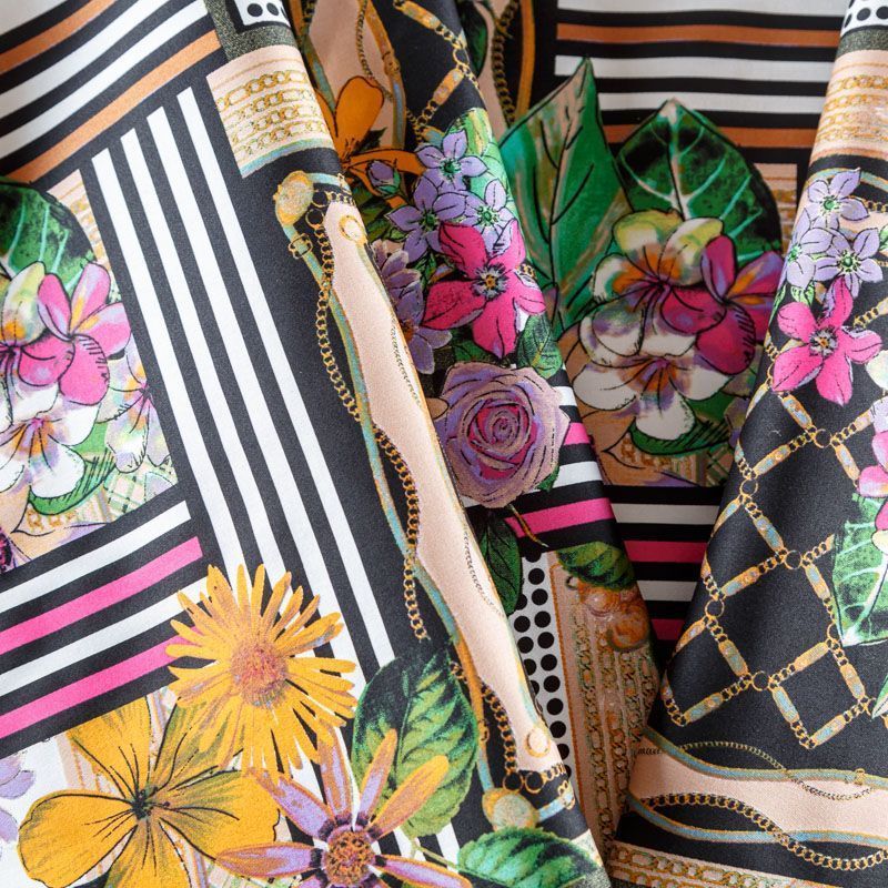 Сатин-коттон в белом цвете с абстрактно-цветочным принтом. Поверхность гладкая со сдержанным блеском, ткань средней плотности, не толстая, хорошо держит форму, тянется за счет эластана в составе. Подойдет для пошива костюма, жакета, юбки, платья, брюк или шорт.