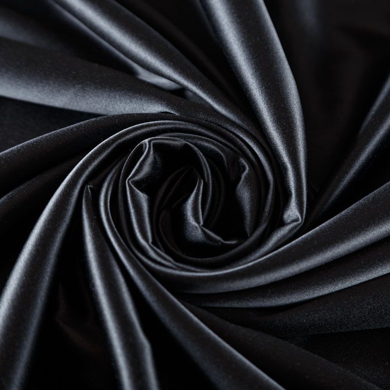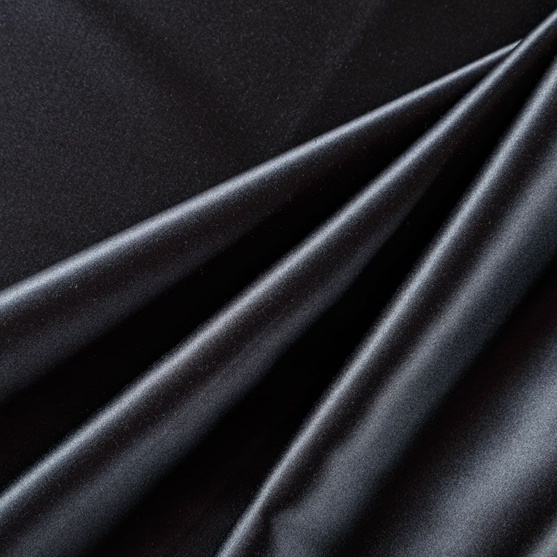 Сатин-коттон в черном цвете, с гладкой поверхностью со сдержанным блеском, ткань средней плотности, не толстая, хорошо держит форму, тянется за счет эластана в составе. Подойдет для пошива костюма, жакета, юбки, платья, брюк или шорт.