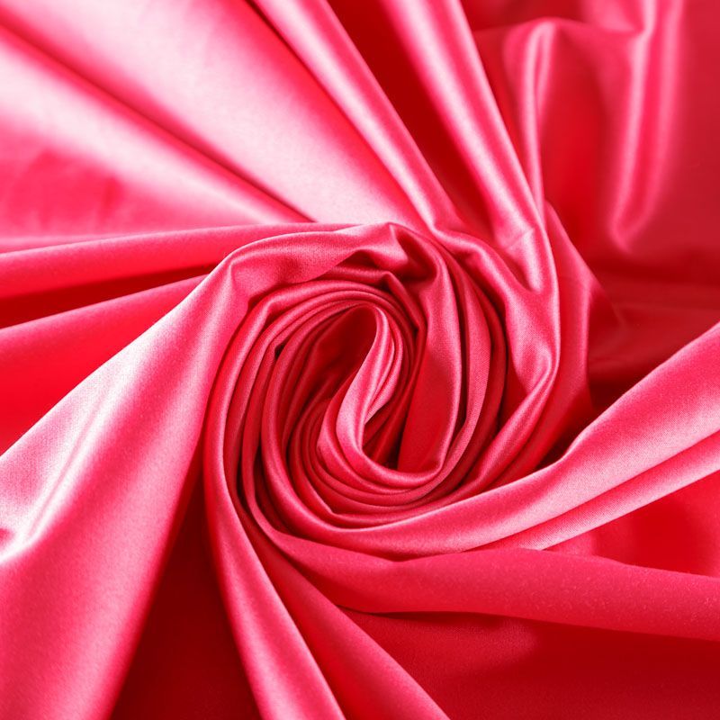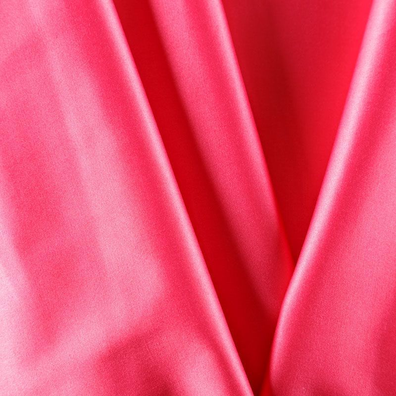 Смесовый сатин-коттон ярко-розового оттенка средней плотности. Поверхность ткани гладкая со сдержанным блеском, материал не толстый, хорошо держит форму, тянется за счет эластана в составе. Подойдет для пошива костюма, жакета, юбки, платья, брюк или шорт.