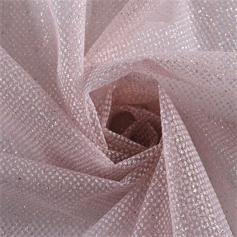 Рельефный прозрачный материал с сетчатой структурой. Поверхность полотна с металлизорованным глиттером, который придает материалу блеск и мерцание. Полотно жесткое, не тянется, отлично держит форму. Сетки нашли свое применение в процессе пошива и последующего декора вечерних нарядов, свадебных платьев, спортивной одежды, театральных костюмов.