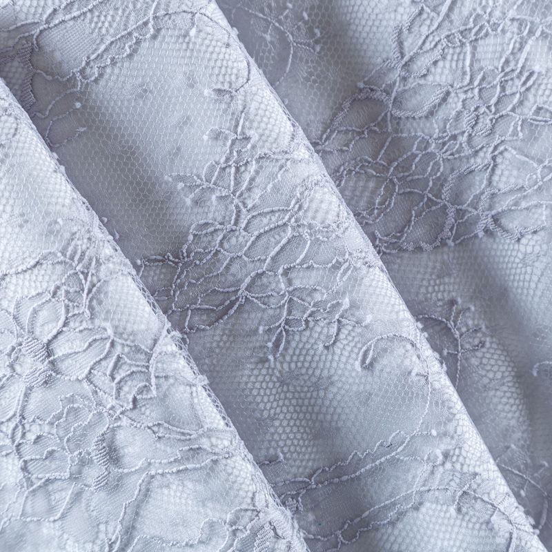 Французское шантильи светло-серого оттенка имеет тончайшее плетение волокон и состоит из нежнейшего кружева, которое используется для пошива свадебных нарядов, праздничных платьев. Вставки из кружева украсят любой офисный костюм, повседневное платье, юбку, блузу. Обе кромки кружева украшены фигурными фестонами. Наирается на изделие объемом.