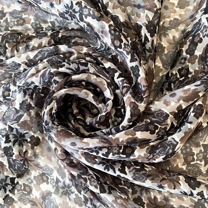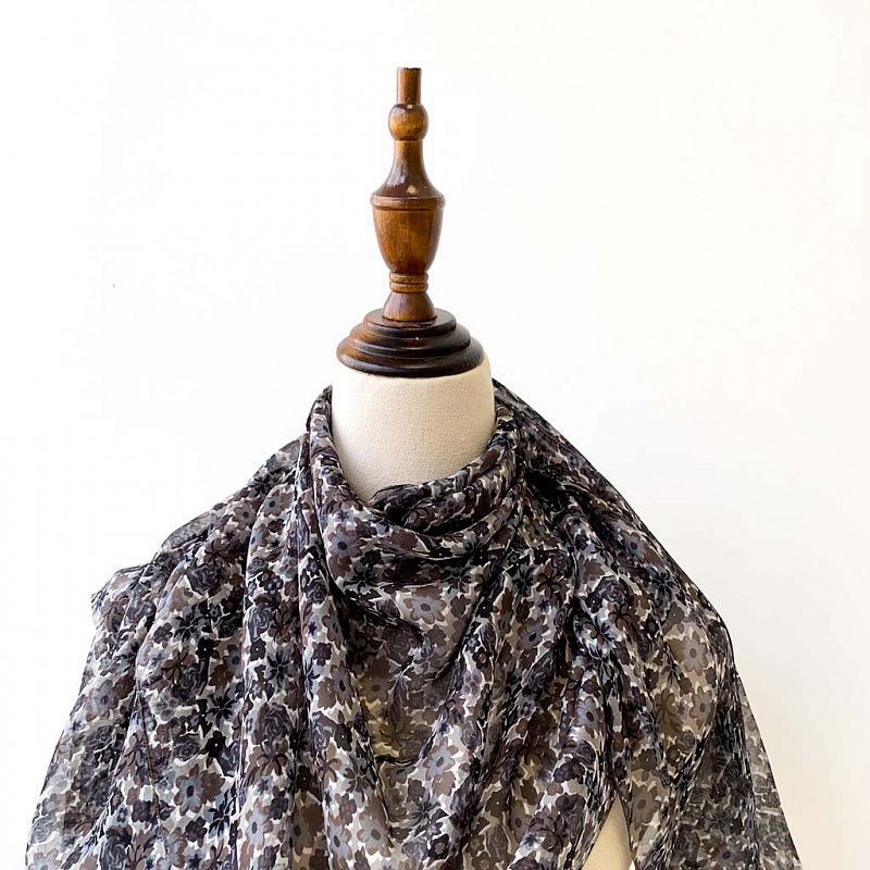 Шарф выполнен из итальянского шелкового шифона серого оттенка с мелким цветочным принтом. Невесомый, воздушный, мягкий и пластичный, летящий, поверхность с красивым матовым блеском. Будет отличным стильным аксессуаром к летнему платью, костюму, пальто.