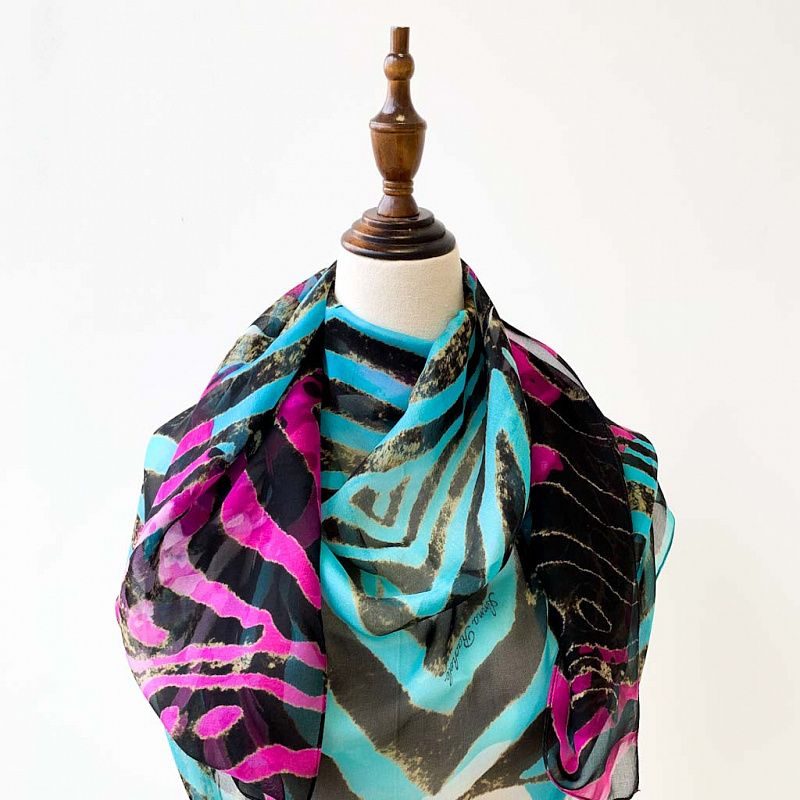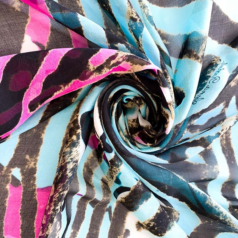 Изящный, нежный и необыкновенный шарф из итальянского шелкового шифона с крупным анималистичным принтом "зебра" в ярких оттенках фуксии и бюрюзы на черном фоне. Невесомый, воздушный, мягкий и пластичный, летящий, поверхность с красивым матовым блеском. Будет отличным стильным аксессуаром к платью, костюму, пальто, жакету.
